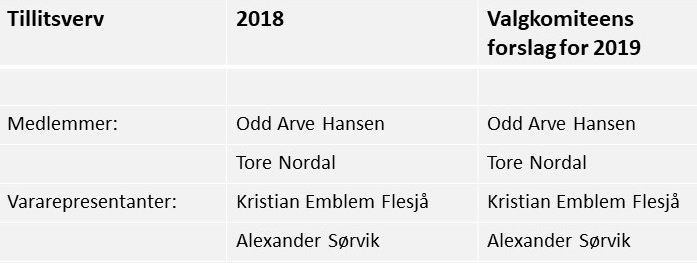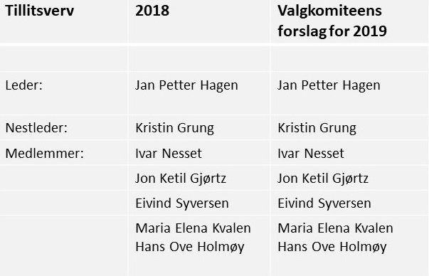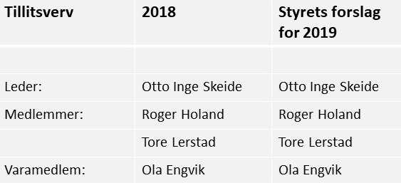 Valgkomiteen er også uendret. Både leder Otto Inge Skeide, medlemmene Roger Holand og Tore Lerstad, samt varamedlem Ola Engvik fortsetter i vervene sine i ett år til.