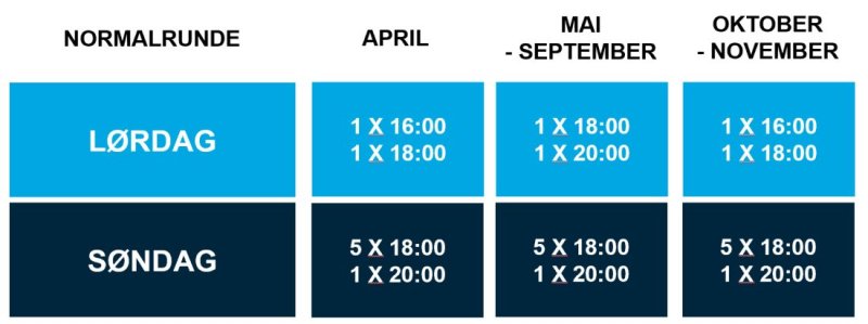 I mai, juni, juli, august og september blir det lørdagskamper klokka 18.00 og klokka 20.00.