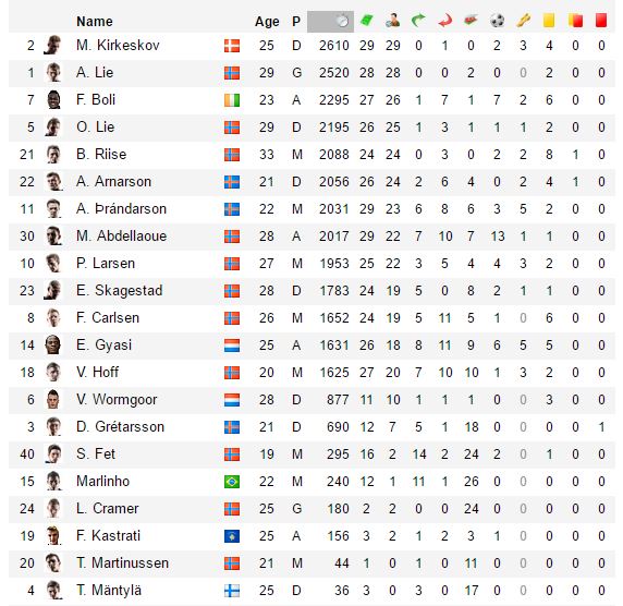 Mostafa Abdellaoue og Aron Thrándarsson var også involvert i 29 kamper, men begge har blitt byttet inn og ut i flere av kampene.