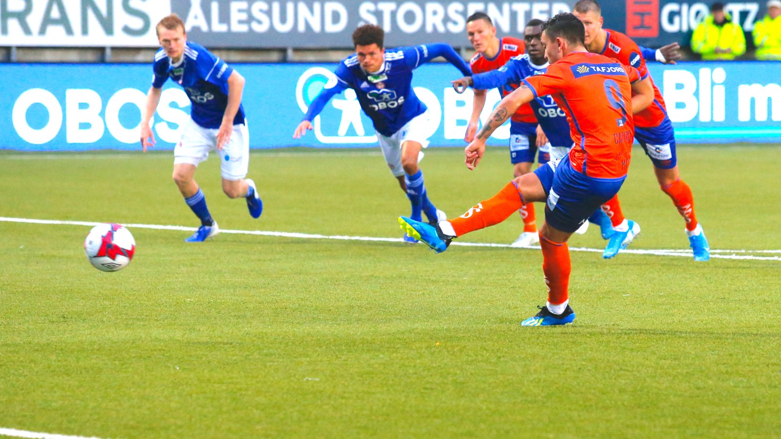 Toppoppgjøret mellom Aalesund og KFUM Oslo startet relativt rolig, men etter 14 minutter skrudde hjemmelaget opp tempoet. Da hang ikke bortelaget med. Niklas Castro stakk ballen gjennom til Torbjørn Agdestein, som kastet seg frem, men keeper avverget. Ballen var fri, og Niklas Castro kastet seg etter kula i duell med gjestenes Kristian Brix. Etter duellen ble Brix liggende, og måtte ut på båre.