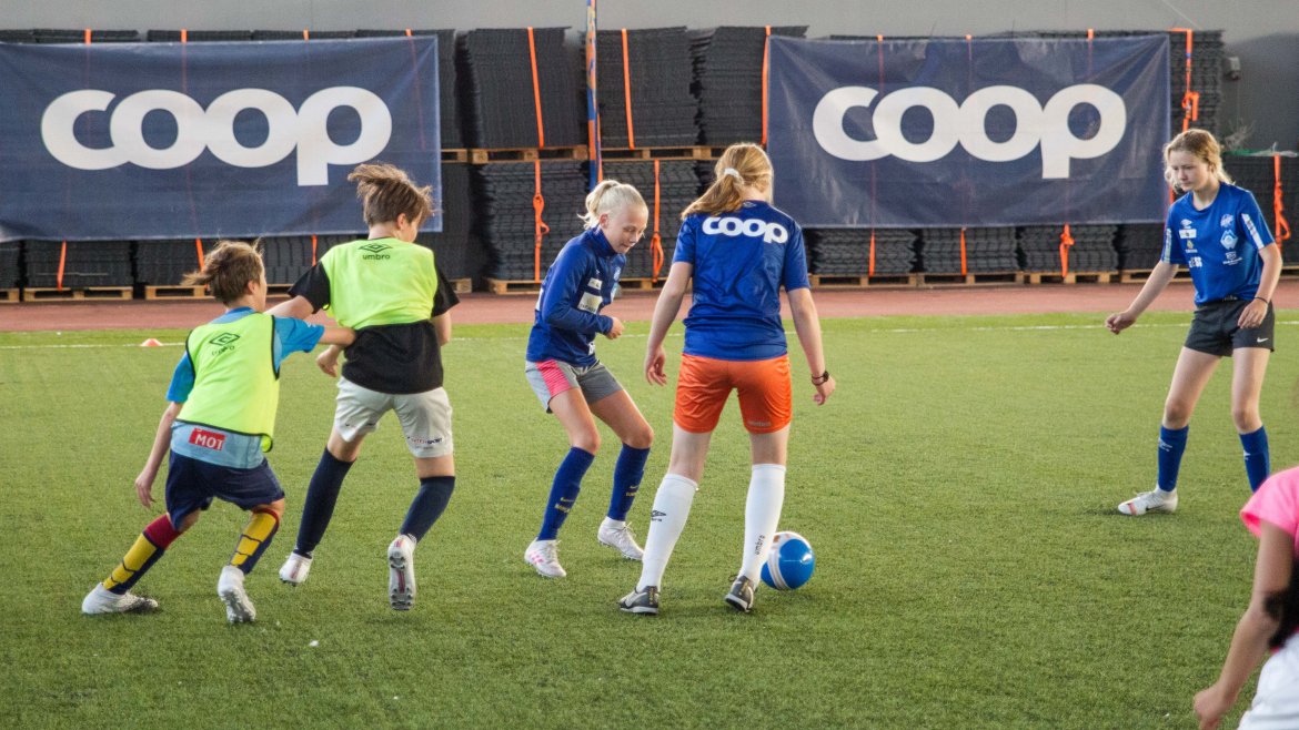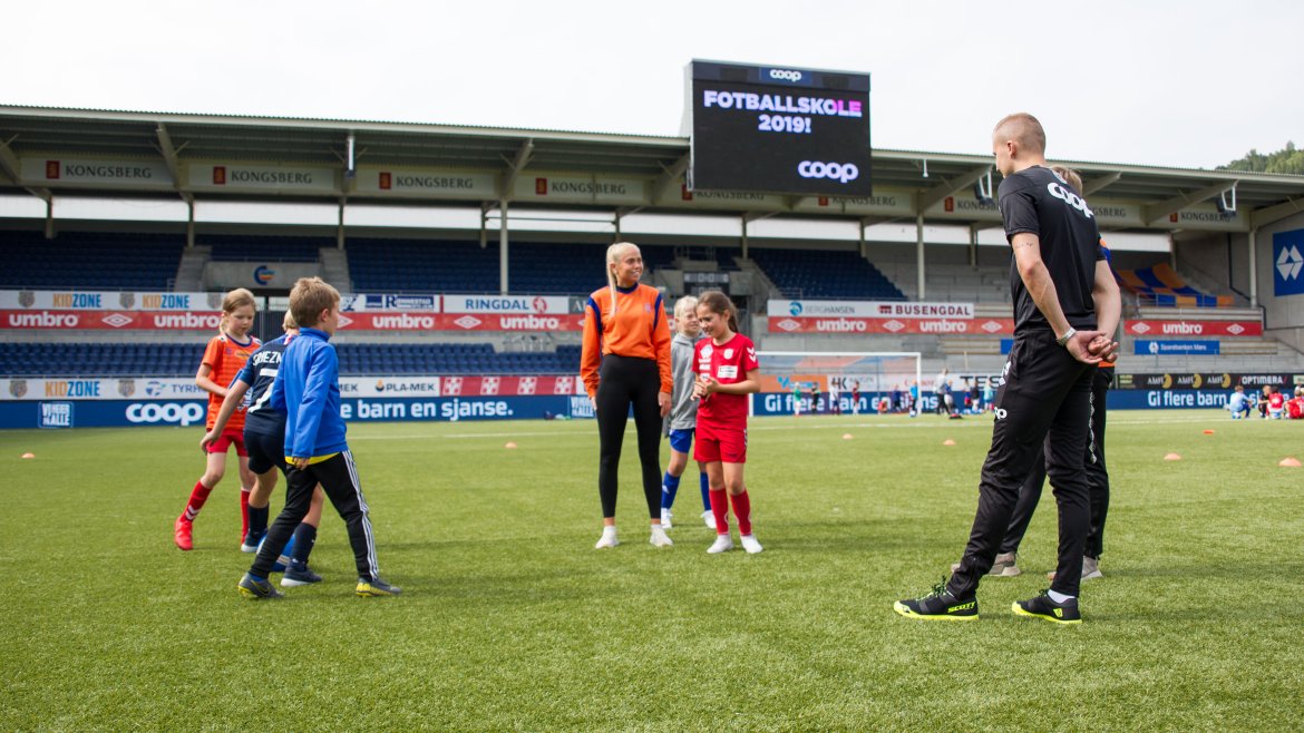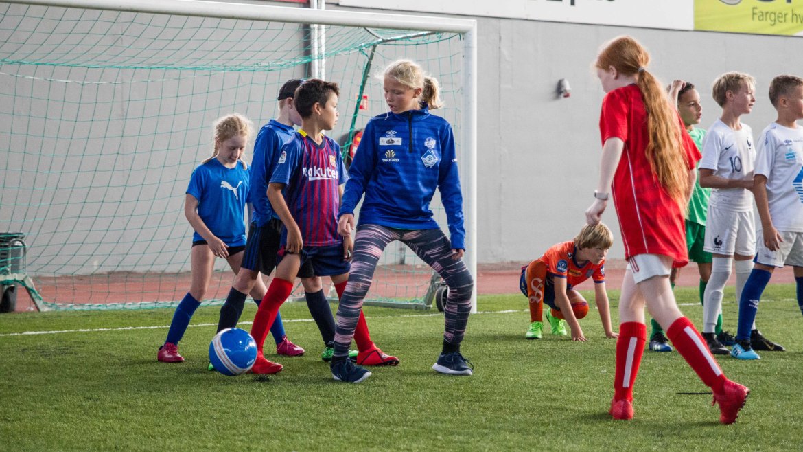 Fotballskolen startet mandag og varer til og med fredag. Guttene og jentene er blitt varme i fotballtrøyene og koser seg med et hav av ulike aktiviteter.