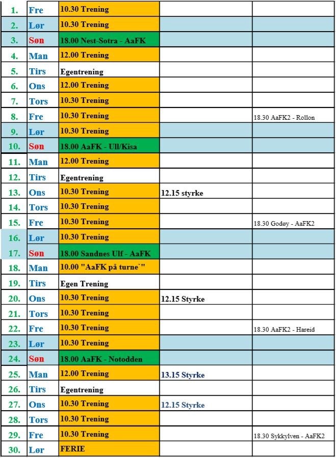 Det er mange som ønsker å være tilstede under treningene til AaFK, dette setter vi pris på. Vi velger å legge ut hele månedsplanen for juni, slik dere ser når laget har sine treningsøkter. Vi vil gjøre oppmerksom på at endringer kan forekomme.